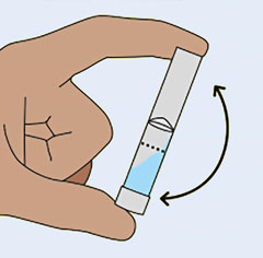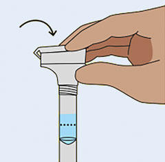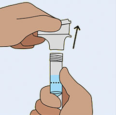 Hold the tube upright with one hand. Close the funnel lid with the other hand by firmly pushing the lid until a loud click is heard. The stabilising liquid in the funnel lid will be released into the tube to mix with the saliva. -